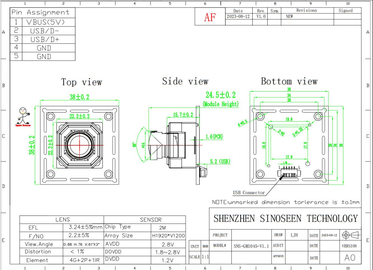 Αυτή η μονάδα κάμερας χρησιμοποιεί έναν αισθητήρα εικόνας CMOS AR0234 1/2,6 ιντσών με ανάλυση 1920x1200. Καταγράφει ομαλό βίντεο μέχρι 90 καρέ το δευτερόλεπτο και παρέχει αξιόπιστη απόδοση πλήρους HD. Ο αισθητήρας διαθέτει τεχνολογία καθολικής έκθεσης και εξάγει συμπιεσμένα δεδομένα RAW 10-bit σε μορφές MJPG και YUV.